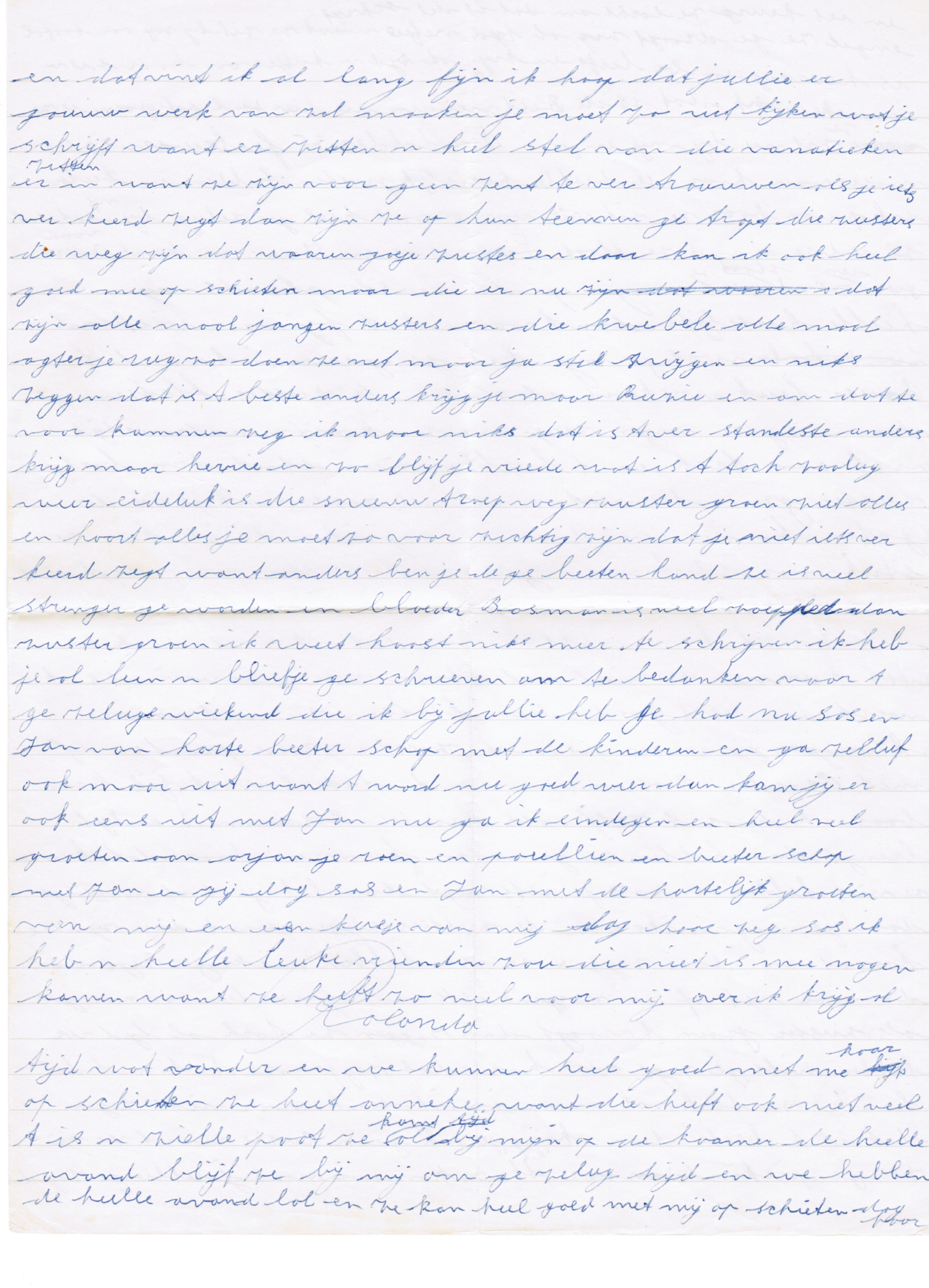 Wat is het toch zaalug weer. Eindelijk is de sneeuw troep weg. Zuster groen ziet alles en hoort alles. Je moet zo voor zichtig zijn dat je niet iets ver keerd zegt want anders be ne je de ge beaten hond. Ze is wel strenger ge worden en broeder Bosman is heel ?????? dan zuster groen. Ik weet haast niks meer te schrijven. Ik heb je al leen ‘n briefje ge schreven om te bedanken voor ‘t gezellige weekend die ik bij jullie heb ge had. Nu sas en jan van harte beter schap met de kinderen en ga zelluf ook maar uit want ‘t word nu goed weer dank an jij e rook eens uit met Jan. nu ga ik eindigen en heel veel groeten aan arjan Jeroen en paullien en beterschap met Jan en jij. Dag sas en jan met de hartelijk groeten van mij en een kusje mij dag hoor.